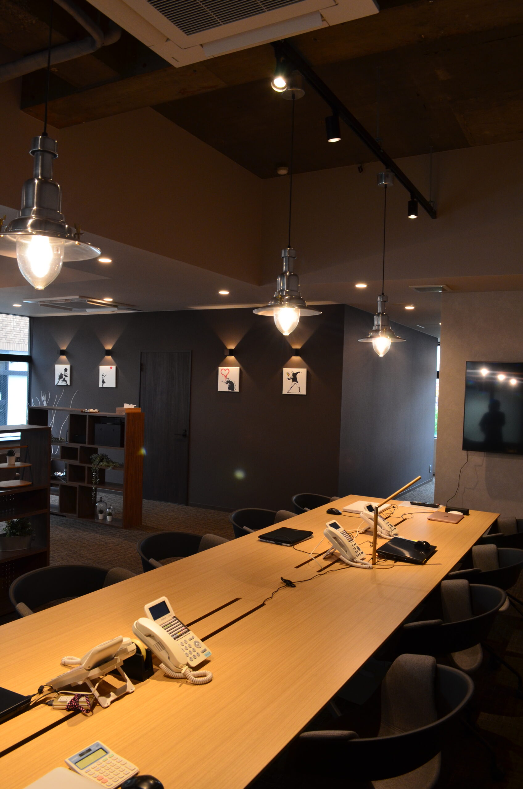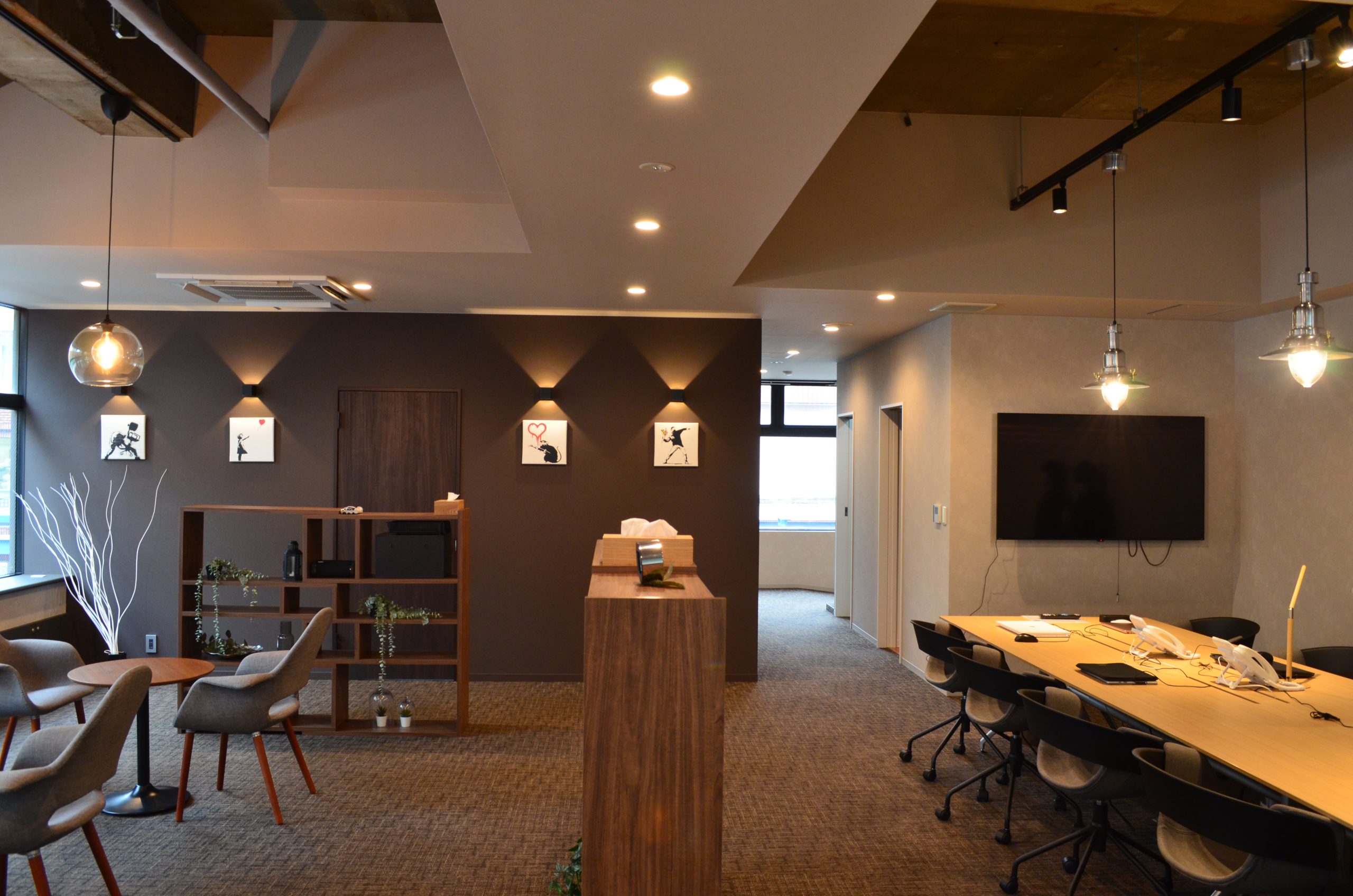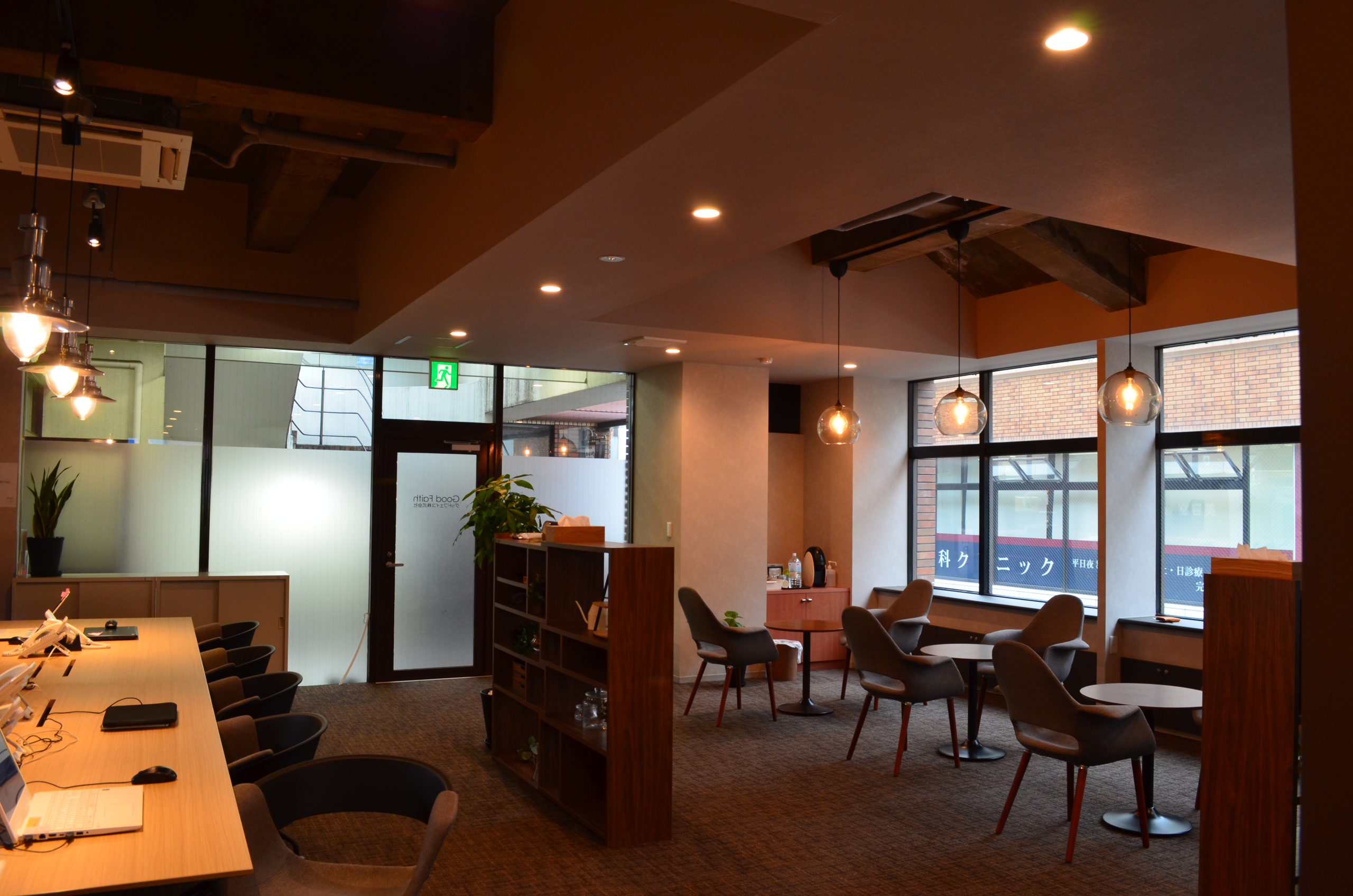 (改修工事後の写真) 社員さんの席は決まっておらず、その日その日に席を移動して利用できるような依頼があり、大きなカウンター型テーブルを設け、自由に移動できる様にしました。 また圧迫感の無いように家具でレイアウトを分けて、円卓にドリンクコーナーも設けて、カフェの様な雰囲気の中で仕事ができるスペースも作らせて頂きました。